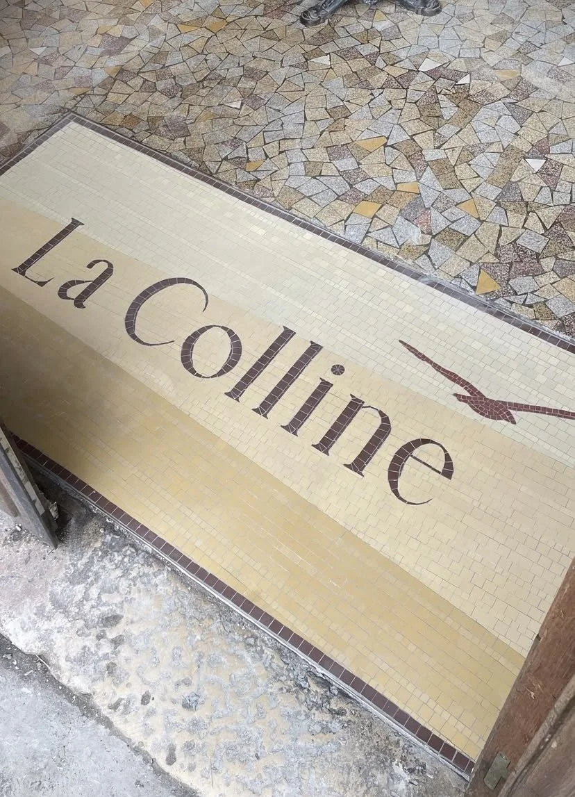 À l’entrée du restaurant La Colline, situé dans le 11ème arrondissement de Paris, cette mosaïque en grès cérame reprend la typographie emblématique de l’enseigne.