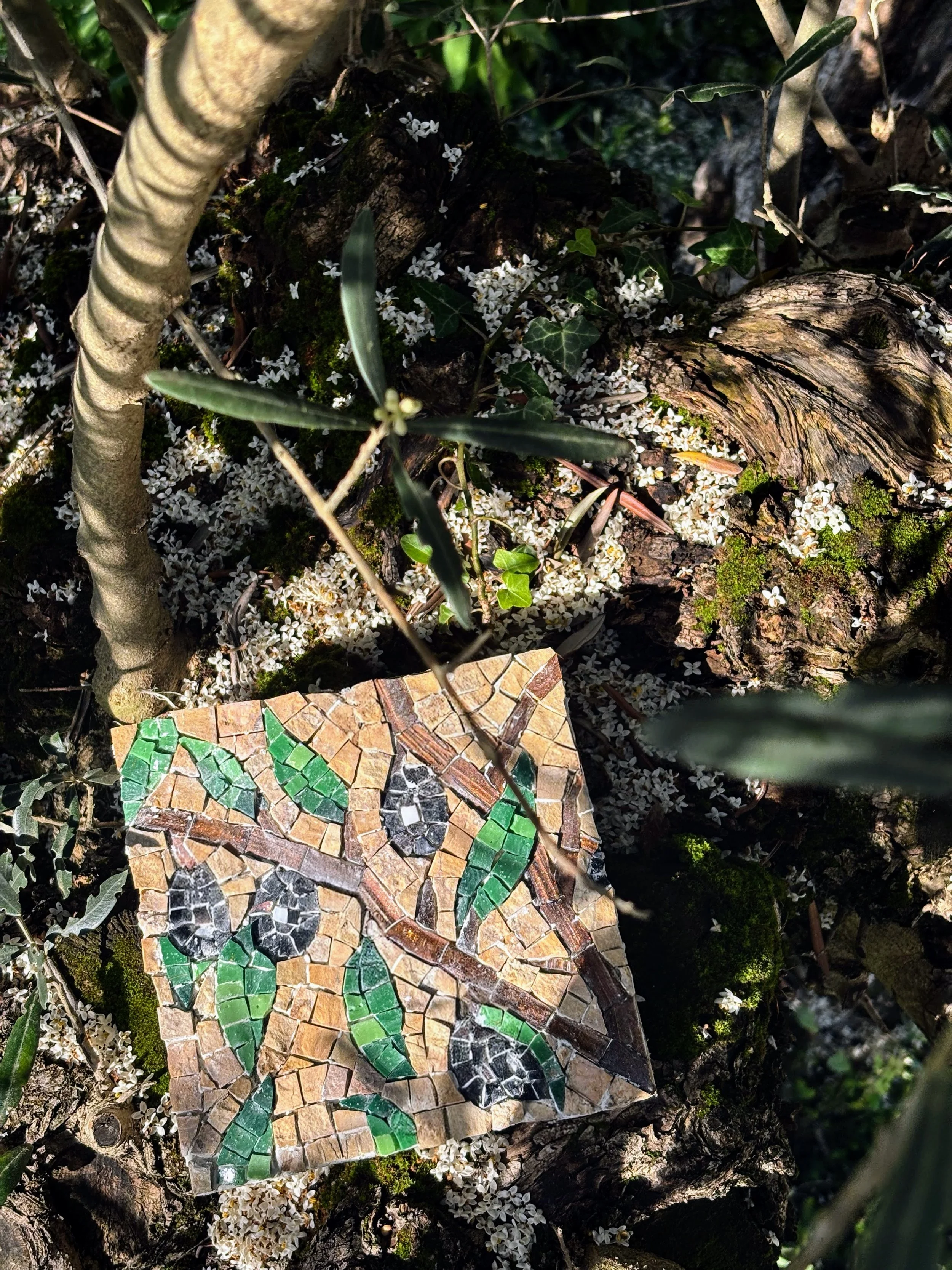 Les feuilles, les olives noires et les branches sont façonnées en pâte de verre, un matériau noble qui capte la lumière et révèle de délicates nuances. Ce travail minutieux apporte profondeur et vie à chaque détail.