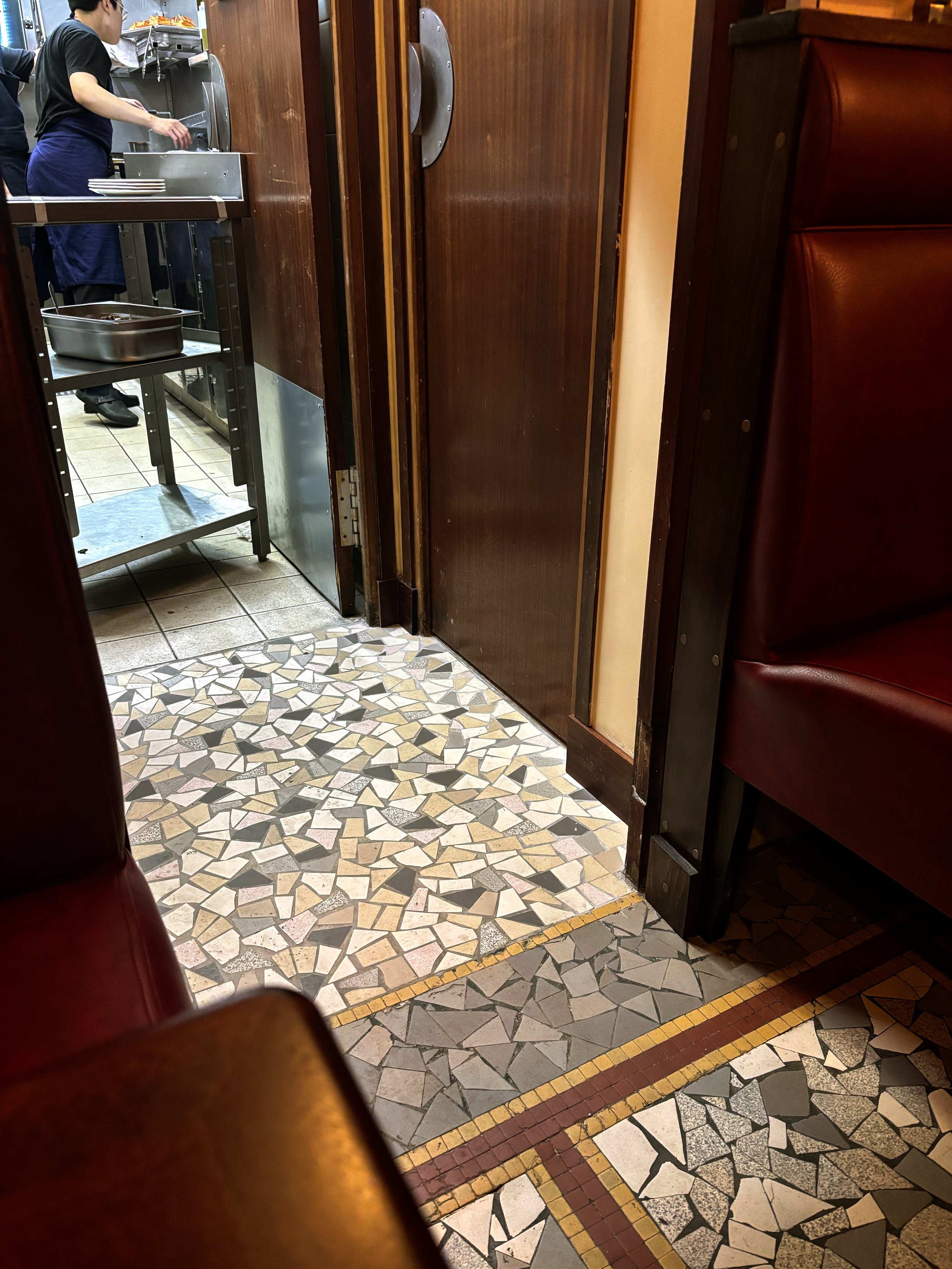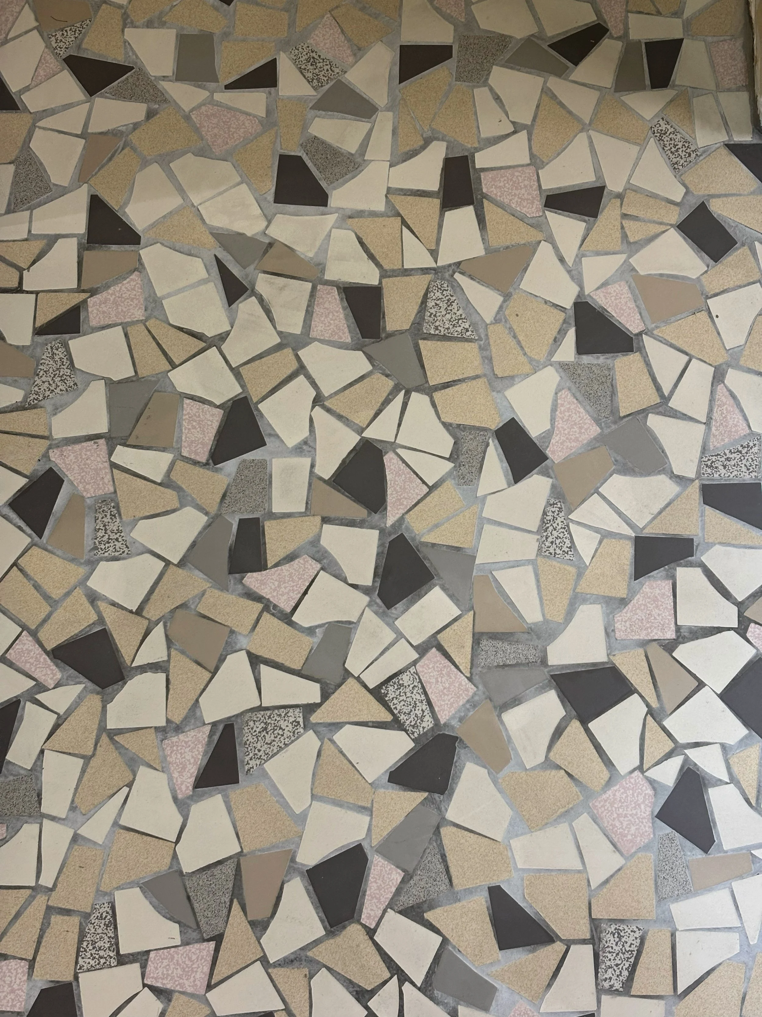 Inspiré de l’esthétique intemporelle des bistrots parisiens, le projet revisite le terrazzo traditionnel à travers une composition libre de fragments de carrelage.