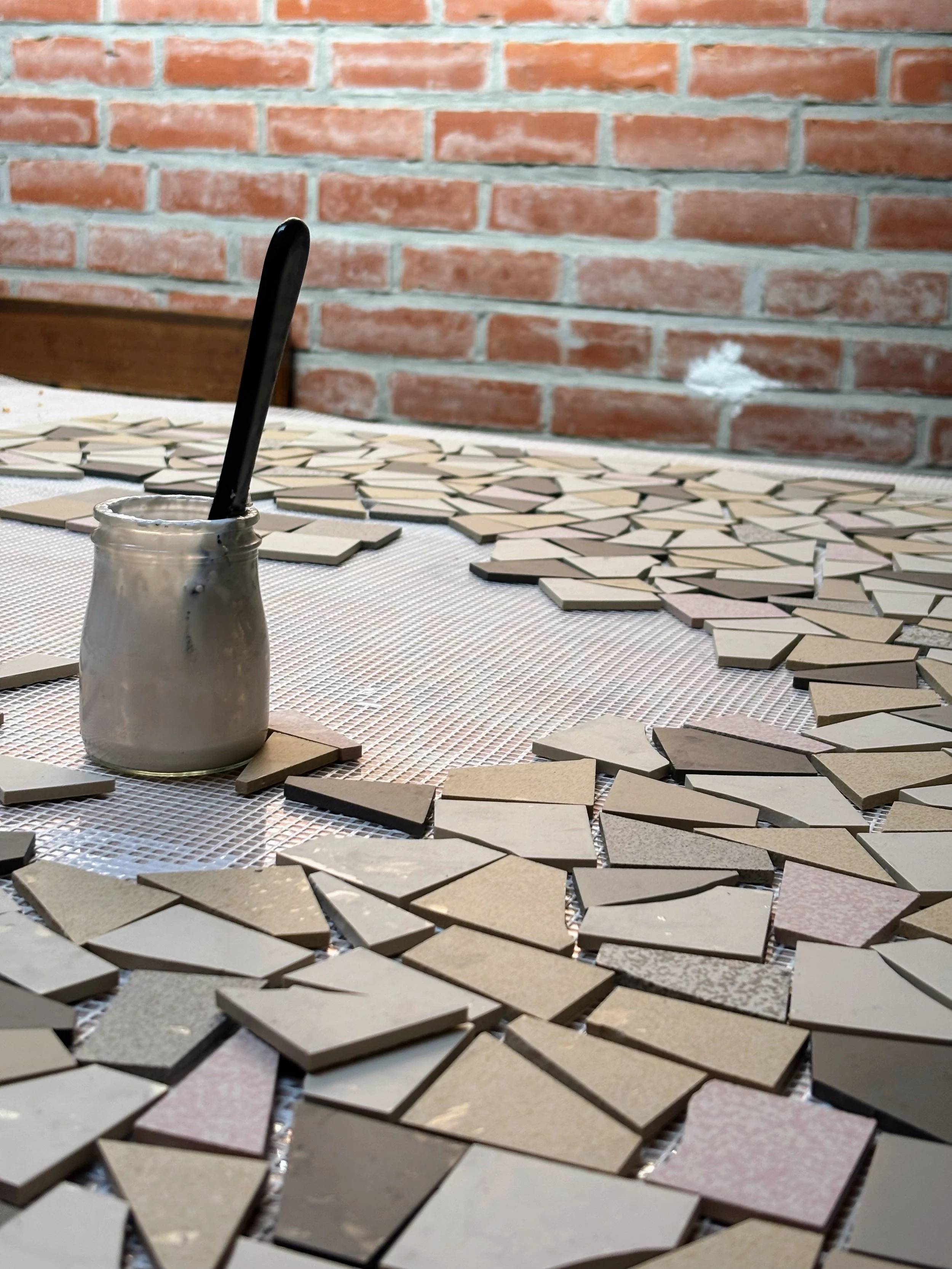 Chaque éclat, soigneusement choisi et disposé, participe à une harmonie de tons doux et contrastés : beiges, bruns, rosés et gris qui évoque le charme patiné des intérieurs anciens.